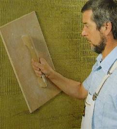 將涂抹好粘膠的第一排巖棉板按照正確位置擺放,然后將巖棉板緊密地粘貼在墻面上,注意防止巖棉板的下墜(采取用木條或支架的方式加以固定),巖棉板周?chē)鷶D出的粘膠必須立即刮掉,以保證粘貼下一塊巖棉板時(shí)板縫中不會(huì )嵌入粘膠。(圖3)